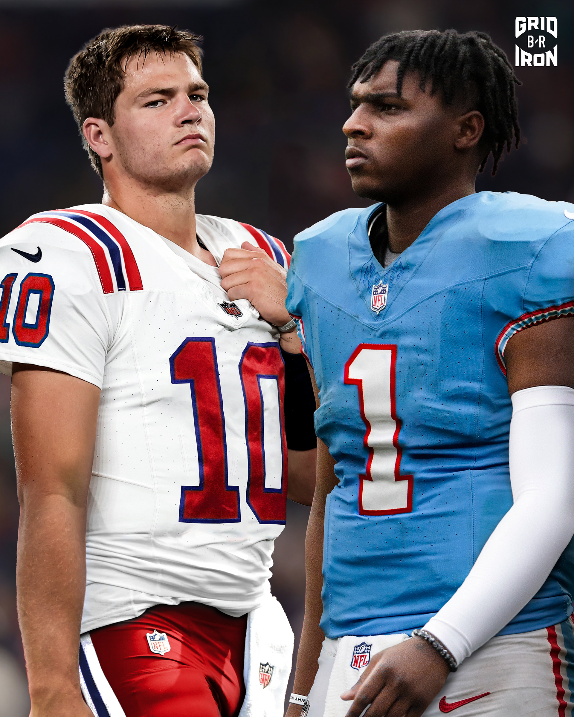 QBs Drake Maye (New England Patriots, Throwback) and Cam Ward (Tennessee Titans, Throwback)